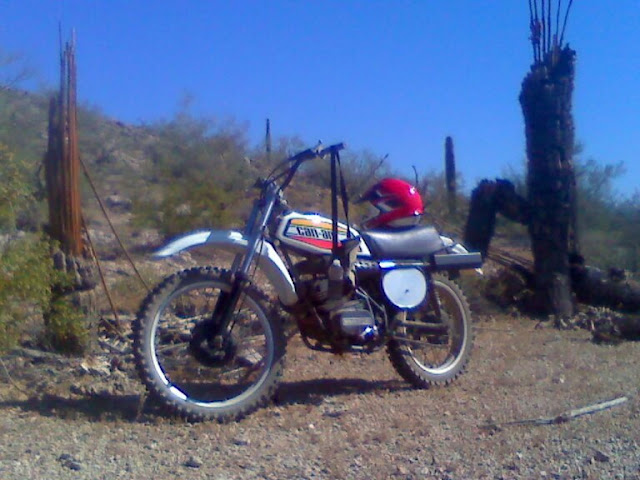 In the late '70s Can Am produced a military bike based on the TNT. In addition to being green and having a center stand it had an oversized steel tank. The Cowboy tracked one down and convinced the seller to put it in a suitcase and bring it over from England (he was coming here anyway).